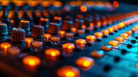 Close-up of a sound mixing board with glowing buttons