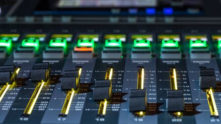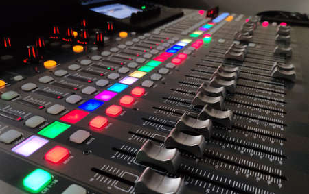 Sound mixer. Professional audio mixing console with lights, buttons, faders and sliders.