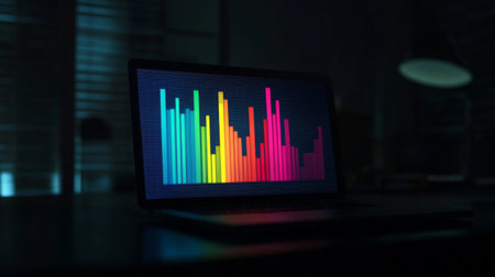 A vibrant sound wave visualization displayed on a laptop screen illuminates a dimly lit workspace, showcasing technology's role in music and data analysis.