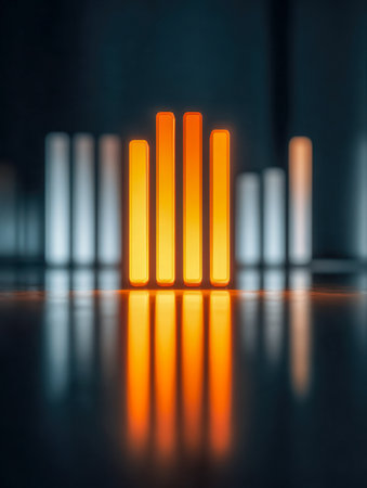 Dynamic data display highlighting illuminated orange and white bars on a smooth reflective surface, set against a moody, out-of-focus dark backdrop.
