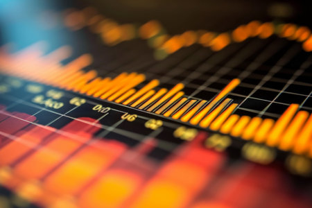 Close-up of financial data on a digital screen with brightly lit orange and yellow bar graphs. Financial analysis, stock market trends, data visualization, business analytics, economic forecasting.