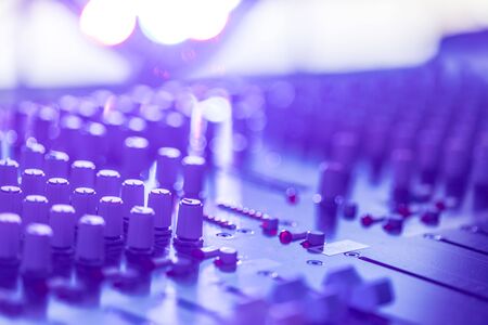Audio mixer console and professional sound mixing. Audio mixer control panel with buttons and sliders. Mixer console for musician DJ and sound engineers.