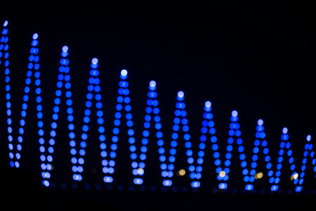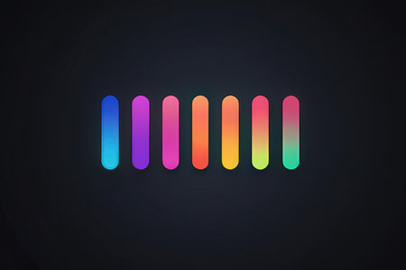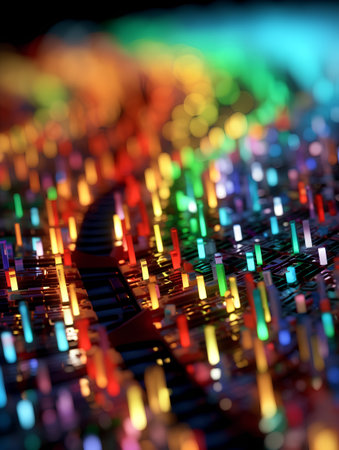This image presents a close-up view of an equalizer display, featuring an array of colorful, illuminated bars. The composition highlights the bright, saturated colors of the lights against a dark backdrop. This visual could be suitable for illustrating technology, sound, or data representation in various commercial applications.