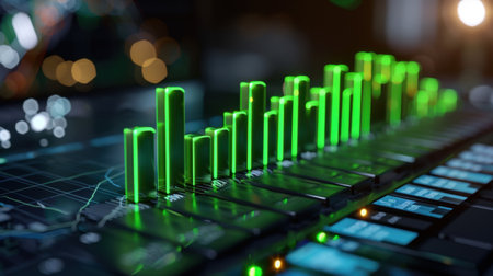 Glowing green digital financial chart displaying stock market trends and data analysis