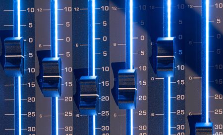 volume fader slider knobs on an audio mixing board close up