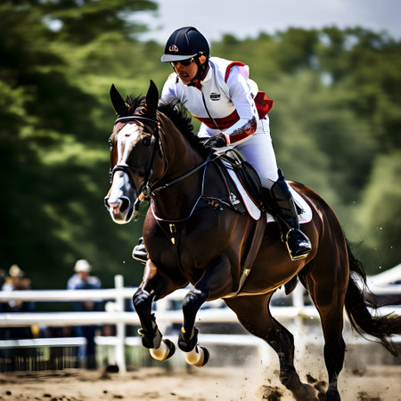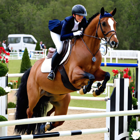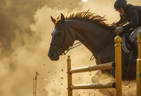 Equestrian jumping competition with horse rider overcoming obstacle in sunny outdoor setting