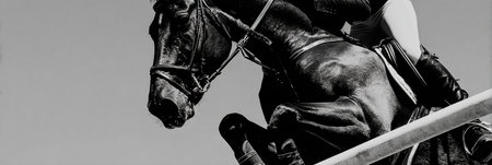 Horse and rider in uniform, monochrome peri. Beautiful black horse portrait during Equestrian sport show jumping competition. Horizontal web header or banner design, copy space.