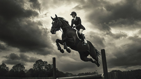 A rider skillfully jumps a wooden fence atop a striking black horse against a backdrop of gray clouds, showcasing their equestrian prowess.