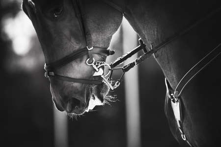 Black and white portrait of a fast beautiful sports horse with a bridle and a snaffle on the muzzle, which is illuminated by sunlight. Horseback riding. Equestrian sport.
