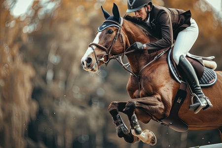 A skilled rider guides a horse over a jump at an equestrian competition in autumn with vibrant foliage.