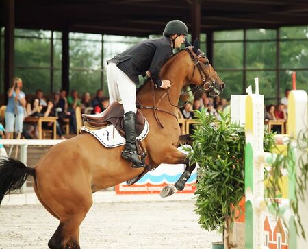Powerful brown horse and rider clearing a jump at an equestrian show jumping competition