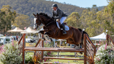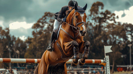 horseback rider skillfully guides their horse hurdle demonstrating perfect synchronization and technique equestrian event set vibrant outdoor surroundings.