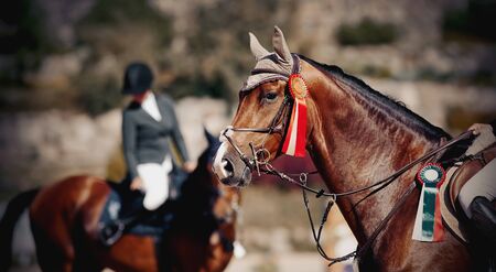 Portrait sports brown stallion in the bridle after the competition with premium rosettes. Dressage of horses. Equestrian sport.