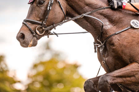 Equestrian sport. Portrait sports brown stallion in the double bridle.The leg of the rider in the stirrup, riding on a brown horse. Dressage of horses.