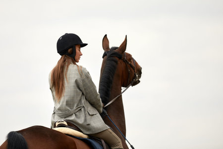 Beautiful young woman riding a horse outdoor. Concept of animal care. Rural rest and leisure. Idea of green tourism. Young european woman wearing helmet and uniform.