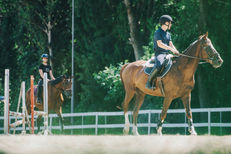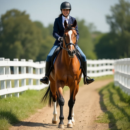 Focused female rider practices horseback riding in a tranquil outdoor setting, perfecting her equestrian skills. A.I.