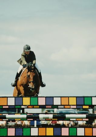 Equestrian rider jumping with text space, showcasing precision and athleticism in horseback sport.
