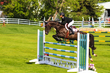 CALGARY CANADA - JUN 7 2015: Unidentified rider in action during the prestige's Spruce Meadows International hors jumping competition, riders comes all over the world to compete.