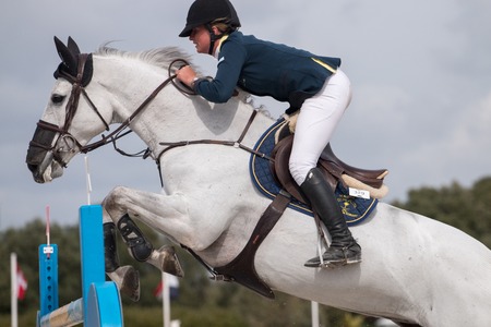 SOLNA, SWEDEN - NOV 26, 2016: Elin Lundin at the Prince Carl Philip prize event in ponny jumping at the Sweden International Horse Show in Friends arena.