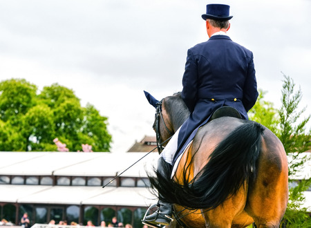 Equestrian sport. Portrait sports stallion in the double bridle. The leg of the rider in the stirrup, riding on a brown horse. Dressage of horses in the arena.