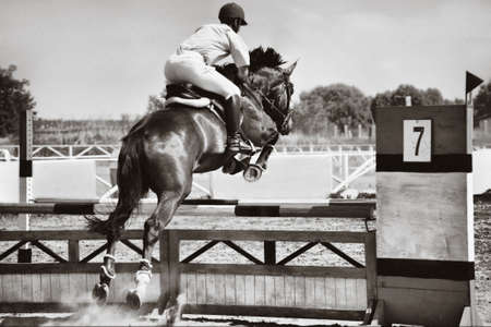 Horse and rider in uniform, duo tone. Beautiful black horse portrait during Equestrian sport show jumping competition. Horizontal monochrome web header or banner design, copy space.