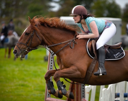 ATHENRY - JULY 3: Young woman Emma Devaney jumping with Horse at annual Athenry Agricultural Show on July 3, 2011 in Athenry, Ireland.