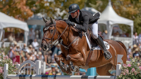 A skilled rider expertly guides a horse over a jumping obstacle during a lively equestrian competition, showcasing the beauty and excitement of the sport.