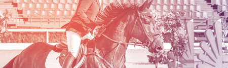Rider and horse in jumping show. Beautiful girl on sorrel horse in jumping show, equestrian sports. Light-brown horse and girl in uniform going to jump. Horizontal web header or banner design.