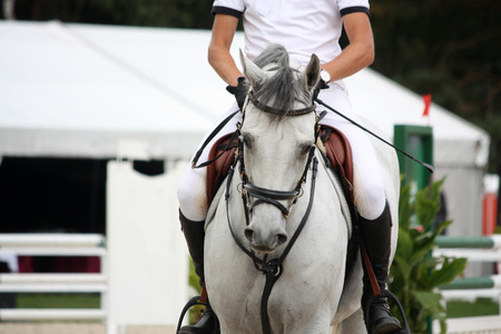Horse and rider in uniform. Beautiful white horse portrait during Equestrian sport show jumping competition, copy space.