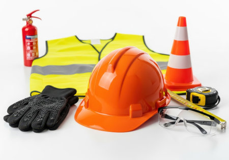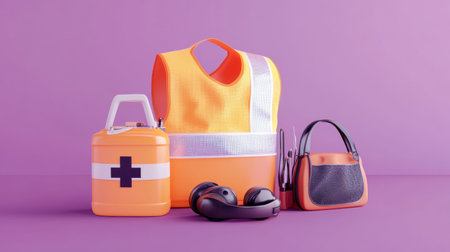 Essential safety gear including high-visibility vest, first aid kit, noise-canceling headphones, and tools bag, promoting workplace safety. Generative AI
