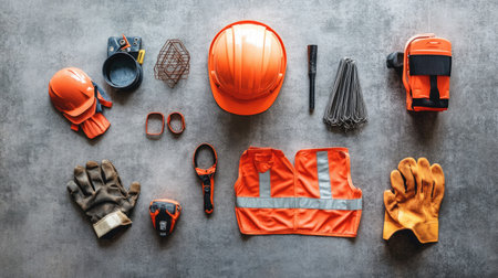 This image showcases an array of essential safety gear including helmets, gloves, and vests on a textured concrete surface, ideal for construction imagery.