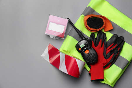 Set of safety equipment and helmet on grey background. Safety concept.