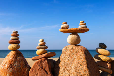 Several Rock zen pyramids of colorful pebbles standing on the beach, on the background of the sea. Concept of life balance, harmony and meditation