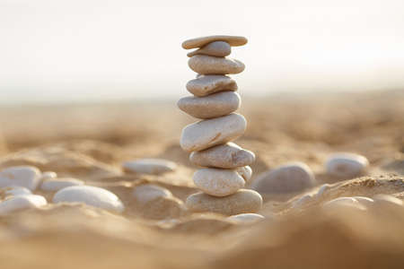 Stone balance on the beach at sunset. Pyramid of the small pebbles on the beach. Stones, against the background of the sea shore during sunset.