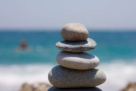 Pyramid stones on the seashore on a sunny day on the blue sea background. Happy holidays. Pebble beach, calm sea, travel destination. Concept of happy vacation on the sea, meditation, spa, calmness.