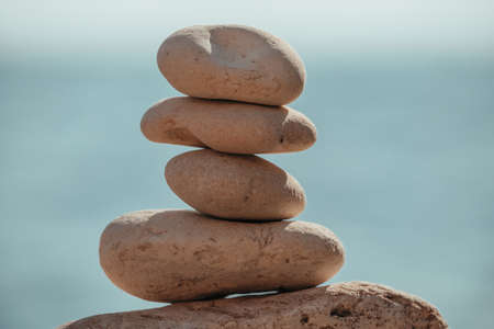 Balanced Pebbles Pyramid on the Beach on Sunny Day and Clear Sky at Sunset. Blue Sea on Background Selective focus, zen stones on sea beach, meditation, spa, harmony, calm, balance concept.