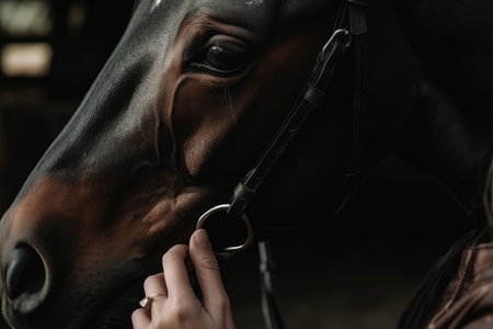 Thoroughbred stallion in bridle, focus on mane, outdoors on farm generated by artificial intelligence