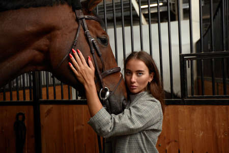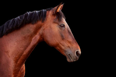 Portrait of a beautiful bay horse with a bridle on its muzzle during evening twilight. Equestrian sports.