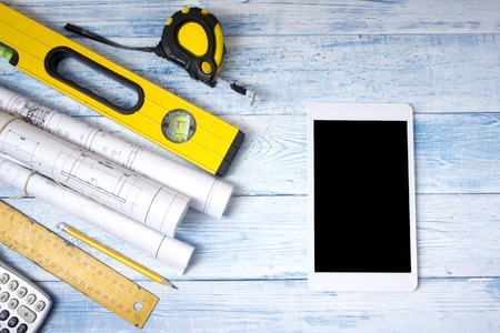 Blueprint with compass, calculator and level