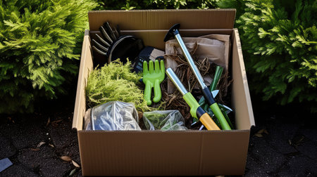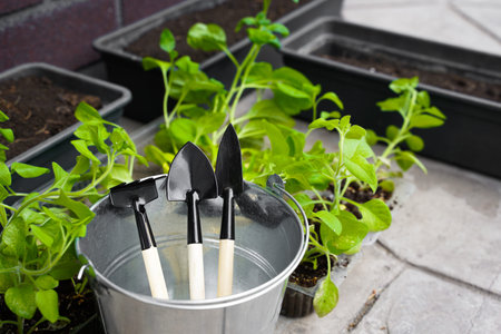 Gardening tools and plants, springtime and summertime work in garden.