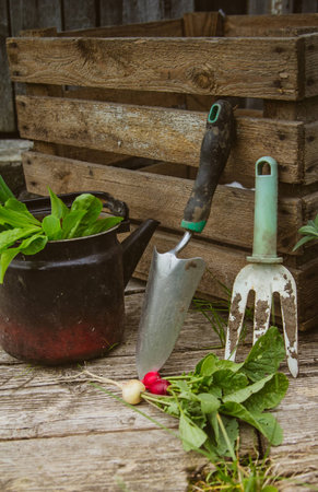 Radish salad green onion garden tools stand on a wooden box background