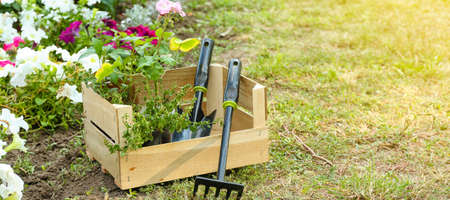garden tools and flowers in wooden box at summer