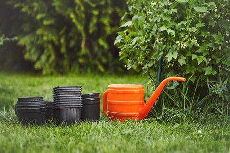 Flower planting pots and an orange watering can stand on the mowed lawn in the garden. Spring background with space for text