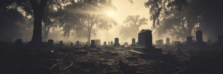 Foggy cemetery with weathered tombstones and trees. Mysterious atmosphere
