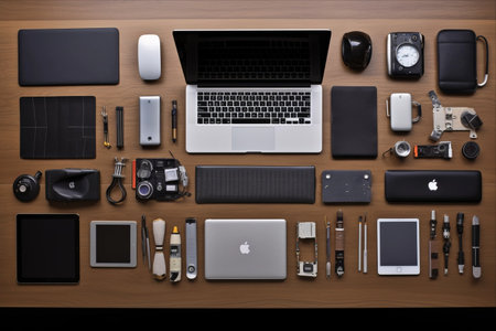 A laptop, cell phone, camera, and other electronic devices neatly arranged on a wooden table, Incorporating branding elements into promotional materials