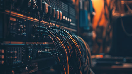 A captivating close-up showcasing an array of colorful cables and audio equipment controls in a professional studio environment, conveying creativity and technology.