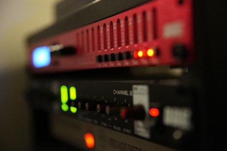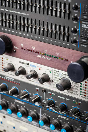 Professional sound recording audio studio digital equipment, amplifier, knobs and graphic equalizer analog controls.