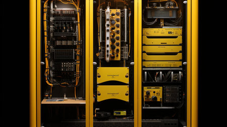 close-up of server rack with blinking lights, cables, and hardware visible, created with generative ai