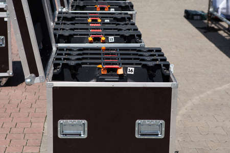Concert or musical equipment in large metal boxes. Preparing for a mass event on a city street. Organization of events. Transportation of sound equipment.