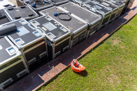 Boxes with sound and lighting equipment and cables near a concert stage during setup. Preparing for an outdoor music show with professional audio gear.